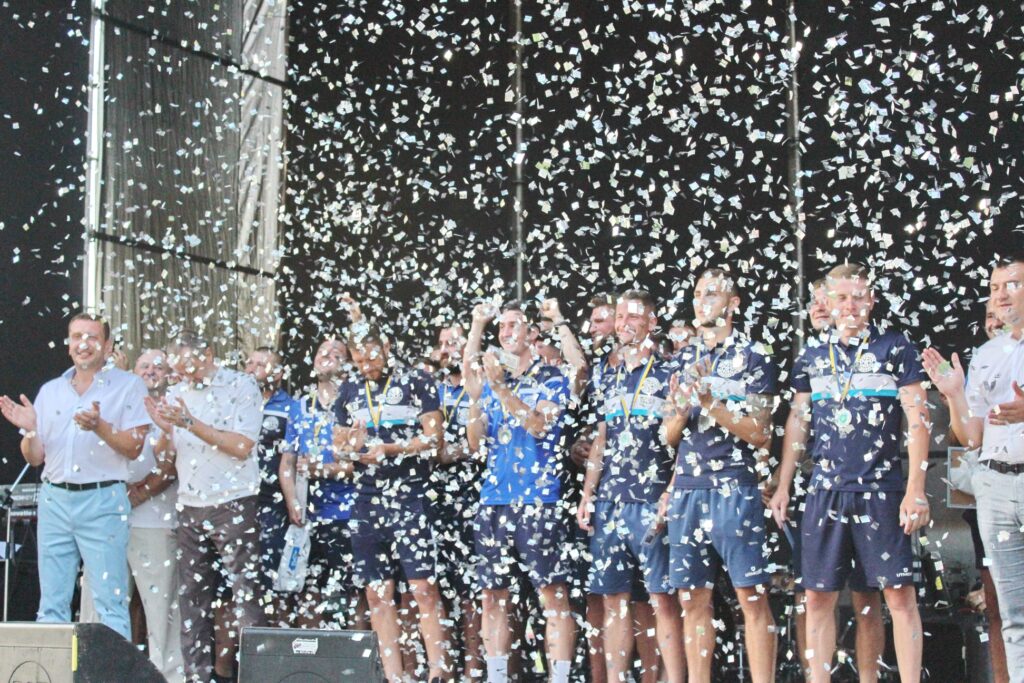Урочиста хода по вул.Проскурівській, привітання та нагородження, подарунки, концерт за участі рок-гурту Stanza … всі ці дійства пройшли вчора у Хмельницькому з нагоди виходу ФК “Поділля” у Першу лігу.