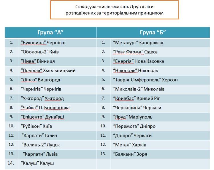 «Буковина» (Чернівці), «Оболонь-Бровар-2» (Буча), «Нива» (Вінниця), «Поділля» (Хмельницький), «Діназ» (Вишгород), ФК «Чернігів», ФК «Ужгород», «Чайка» (Петропавлівська Борщагівка), «Епіцентр» (Дунаївці), «Рубікон» (Вишневе), «Карпати» (Галич), «Волинь-2» (Луцьк), «Карпати» (Львів), ФК “Калуш“.