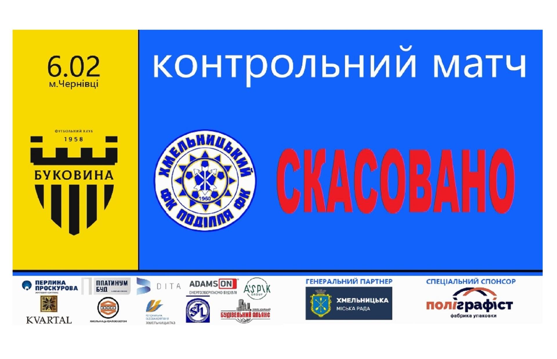 Як повідомили з чернівецького клубу, у зв’язку із погіршенням погодних умов та специфікою умов оренди стадіону – не має можливості підготувати штучне поле на раніше узгоджену дату. Тож запланований на 6 лютого поєдинок “Буковина” – “Поділля” не відбудеться.